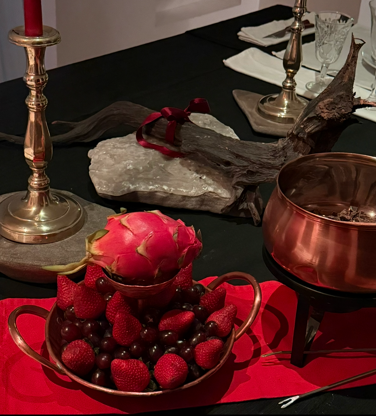 En Kerxk’en, ese dragón reaparece en el centro de la mesa. No se presenta como figura dominante ni como objeto sagrado aislado, sino como presencia mediadora. El dragón dialoga con la figura del Cristo, activando una resonancia compartida: transformación, pasaje, muerte y continuidad. Lo escorpiano y lo cristiano se rozan sin jerarquías, como sistemas simbólicos que operan en simultáneo.