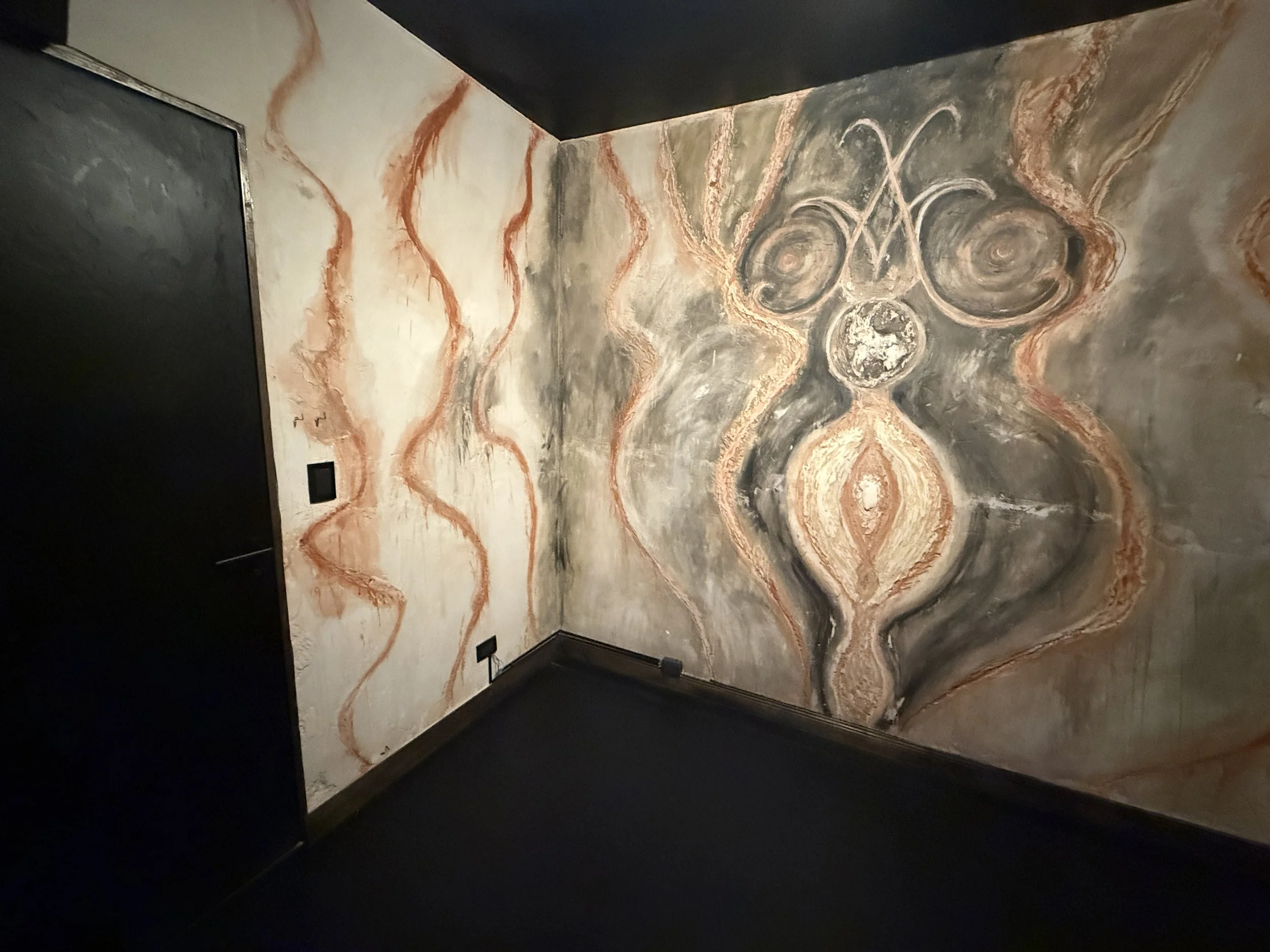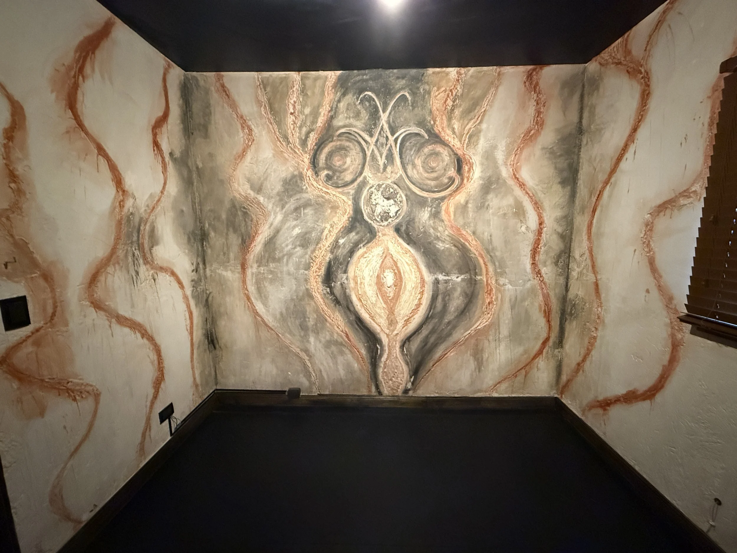 La pared central aloja la figura principal: una Venus–Luna Ancestral, no figurativa en términos clásicos, sino presentada como forma matriz. Su núcleo es una vulva abierta, entendida como portal de gestación, origen y paso. En su interior se inscribe una luna llena, donde se distingue el conejo lunar, símbolo ancestral de fertilidad, regeneración y ciclo vital presente en múltiples cosmologías.