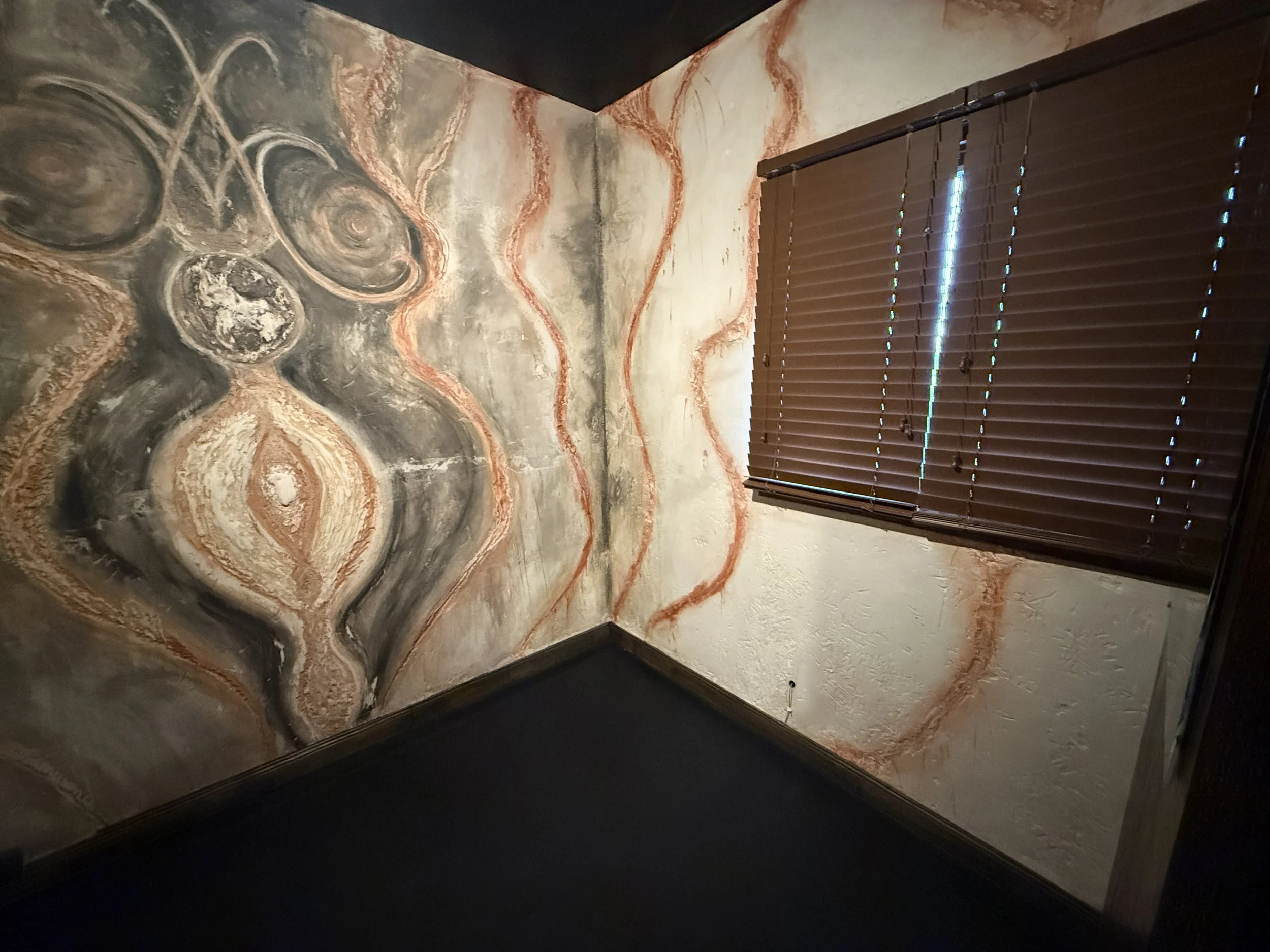 Desde el suelo hasta el cielo raso ascienden líneas flamígeras, serpentinas y orgánicas, que recorren las paredes como flujos de energía vital. Estas líneas fueron construidas tanto por extracción del material —tallando directamente el muro— como por adición de volúmenes modelados. Están pigmentadas con óxidos de hierro (ferrites), pigmentos inorgánicos que remiten a la sangre mineral, al fuego interno de la tierra y a las primeras prácticas pictóricas humanas. Su ascenso continuo conecta el plano terrestre con el celeste, inscribiendo el espacio en una lógica de circulación vertical.