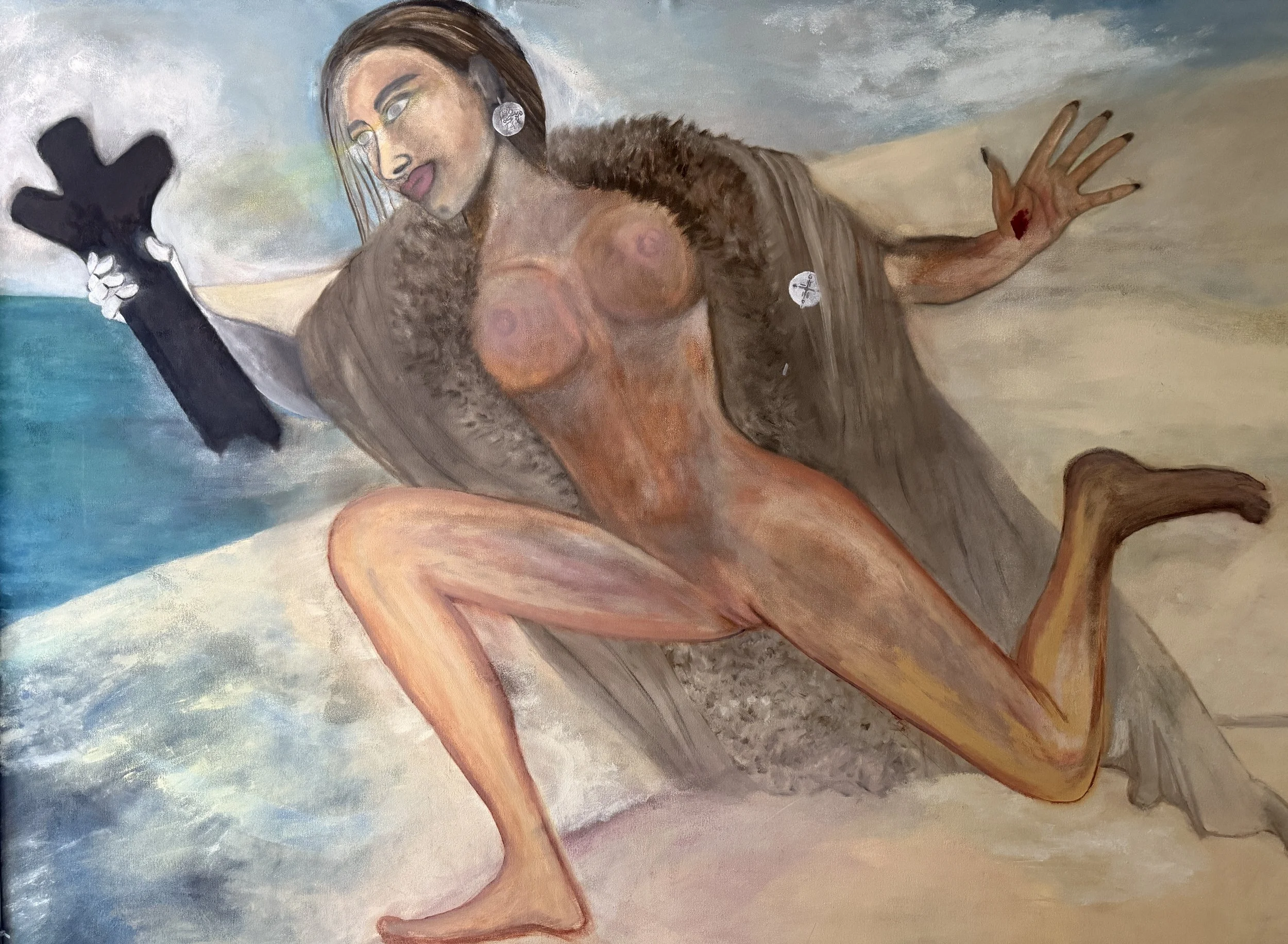 La iconografía articula un sincretismo religioso consciente y estratégico. En una mano, María porta el estigma de Cristo; en la otra, una cruz de madera —Mi Xristo, obra posterior— que resignifica la figura cristiana desde una apropiación íntima, no institucional. En las orejas, aros confeccionados con medallas del escapulario de la Virgen del Carmen; en el cuerpo, un prendedor con la cruz araucana. Estos elementos no establecen oposición ni jerarquía: configuran un sistema simbólico híbrido donde distintas tradiciones coexisten como herramientas de supervivencia espiritual y política.
