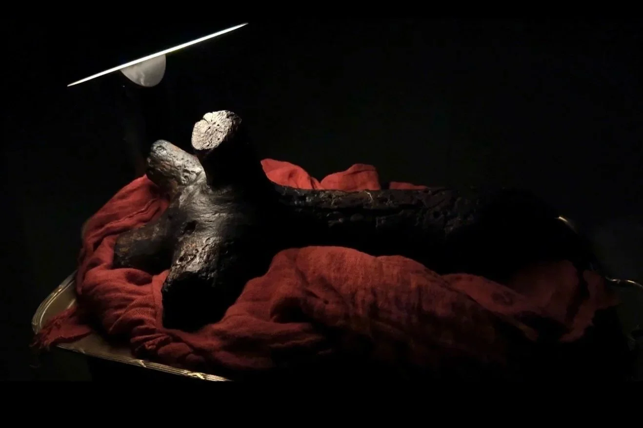 El tratamiento de conservación aplicado a la pieza forma parte constitutiva de la obra. Dado su estado de empapamiento y fragilidad, se optó por un método no acuoso de consolidación acetona–colofonia, utilizado en contextos de arqueología subacuática para objetos altamente degradados. El procedimiento permitió estabilizar la estructura interna de la madera sin alterar su forma ni su lectura simbólica, sustituyendo el agua retenida en la lignina por una resina natural de pino. El resultado es una pieza mecánicamente estable, con oscurecimiento mínimo y sin pérdida de material.