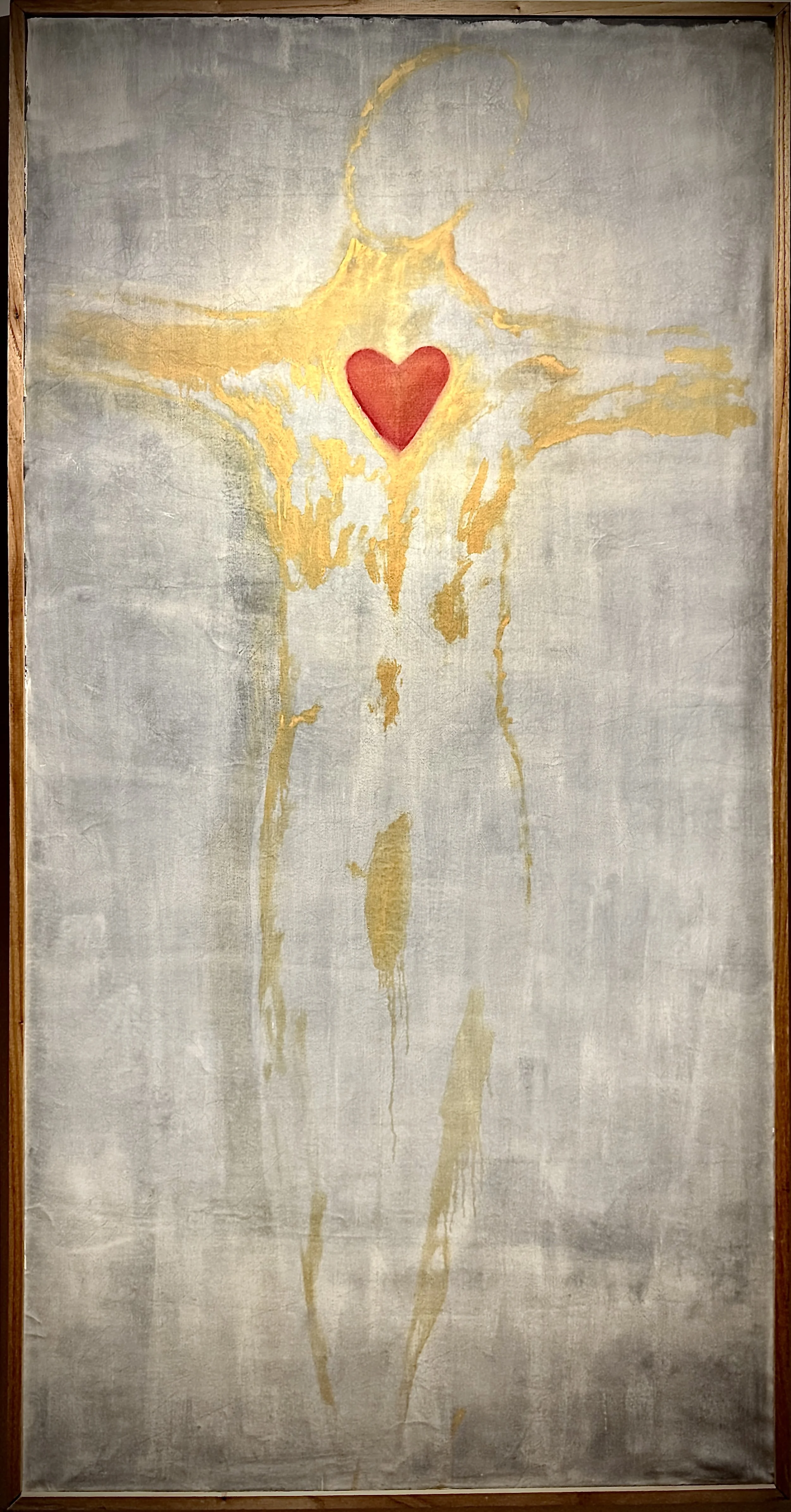En el centro del eje vertical, suspendido en el pecho, se inscribe un corazón rojo, aislado, preciso, encendido. Este corazón no representa únicamente el Sagrado Corazón de Jesús: opera como órgano-orientador, núcleo de decisión y de resistencia. Es el mismo corazón que, en obras anteriores, guía a Aonekken María a través del médano, la tormenta y la pérdida; aquí, condensado en una forma universal, late como punto de anclaje entre lo humano, lo ancestral y lo divino.